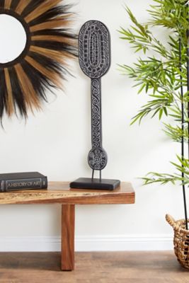 Harper & Willow 10.5 in. x 40 in. Hand-Carved Tribal Paddle Wood Sculpture, Reclaimed Wood Stand, Black
