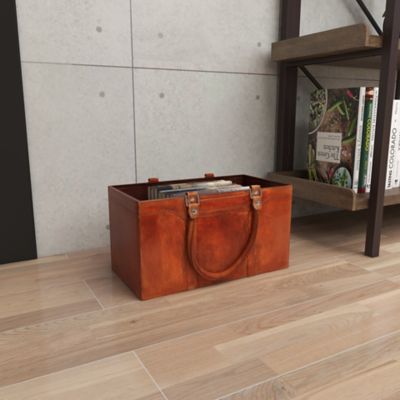 Harper & Willow Rectangular Handmade Authentic Leather Magazine Holder with Leather Handles, 15 in. x 6 in., Brown