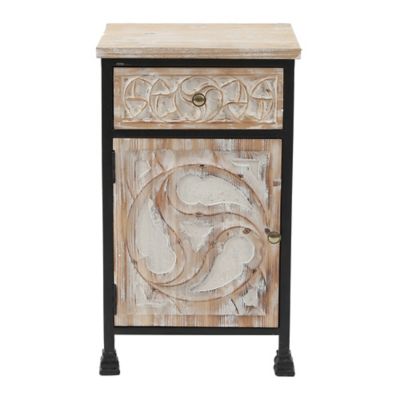 LuxenHome Metal Frame and Carved Wood End Table with 1 Door/1 Drawer, Black