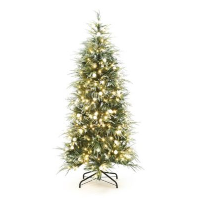 LuxenHome 6.5 ft. Green & Frosty Branches Artificial Christmas Tree Pre-Lit with LEDs and Globe Bulbs