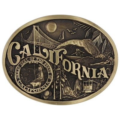 Small, oval cast brass Attitude belt buckle with polished wire trim. Large lettering spelling out California stretches boldly across, surrounded by a set of antiqued figures in celebration of California heritage including the Golden Gate bridge, surfing, a mountain train and the state seal. Our cast belt buckles are acid washed to add the dark antiqued patina and hand buffed to bring out the highlights and details. Standard 1.5 inch belt swivel.