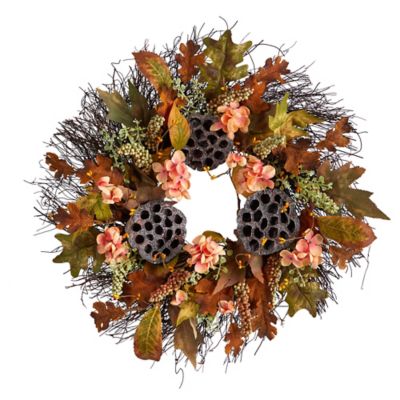 Nearly Natural 22 in. Artificial Autumn Hydrangea and Dried Lotus Pod Fall Wreath