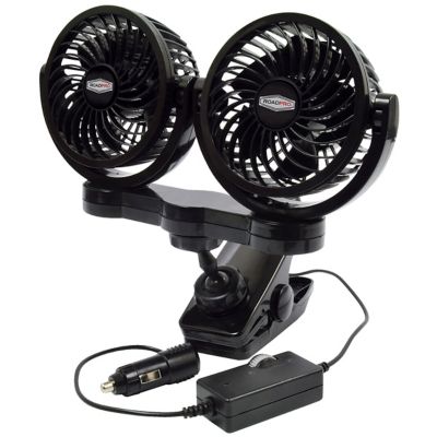 RoadPro 7.1 in. Indoor/Outdoor 12V Truck Dash Fan Dual Personal Cooling Fan with Mounting Clip, 14 CFM