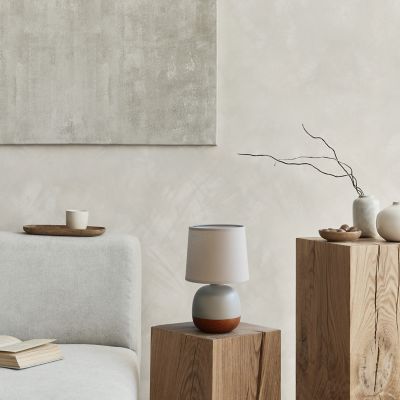 Simple Designs Petite Mid Century Table Lamp, 12 in., Dark Wood, Gray Shade