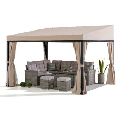 Sunjoy 10 x 12 ft. Wall Mounted Gazebo, Lean to Gazebo, Black Aluminum & Metal Frame with Curtains and Netting
